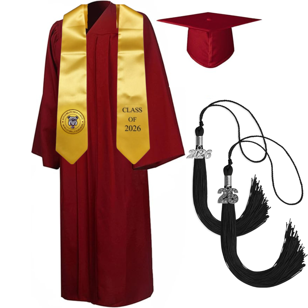 This unit includes the cap, gown, regular tassel plus a Premium Tassel (your choice of an Ice Tassel or Mascot Tassel) and a Custom School Stole.