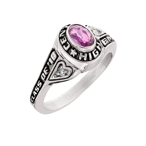 Caroline T55 features your name on the right side and graduation year on the left. Small hearts on each shank are graced with 2pt stones.