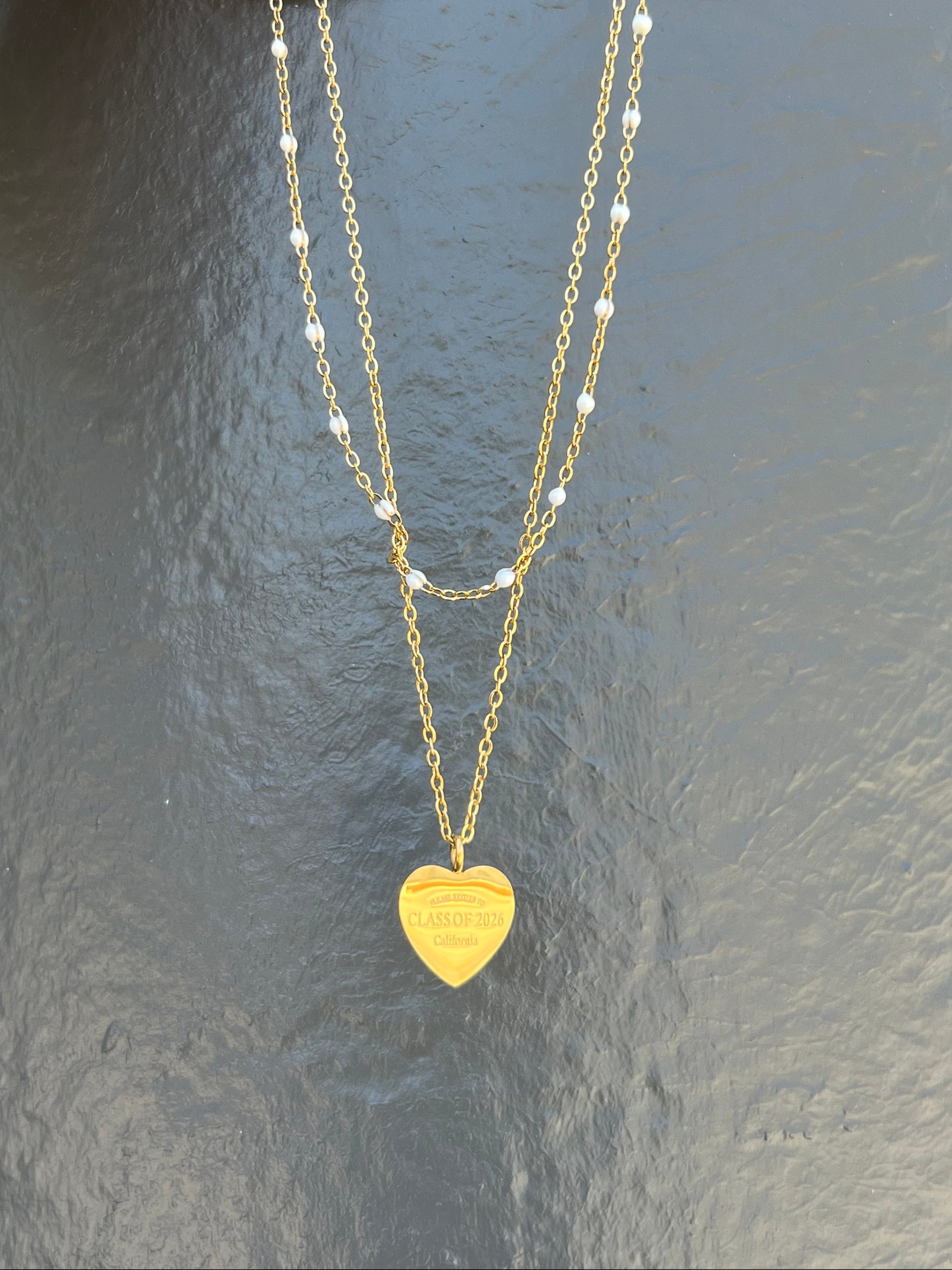 Two-in-one necklace for an instant layered necklace look. Featuring "Please Return to Class of 2026 California" engraving.